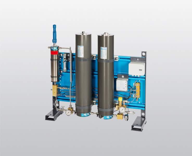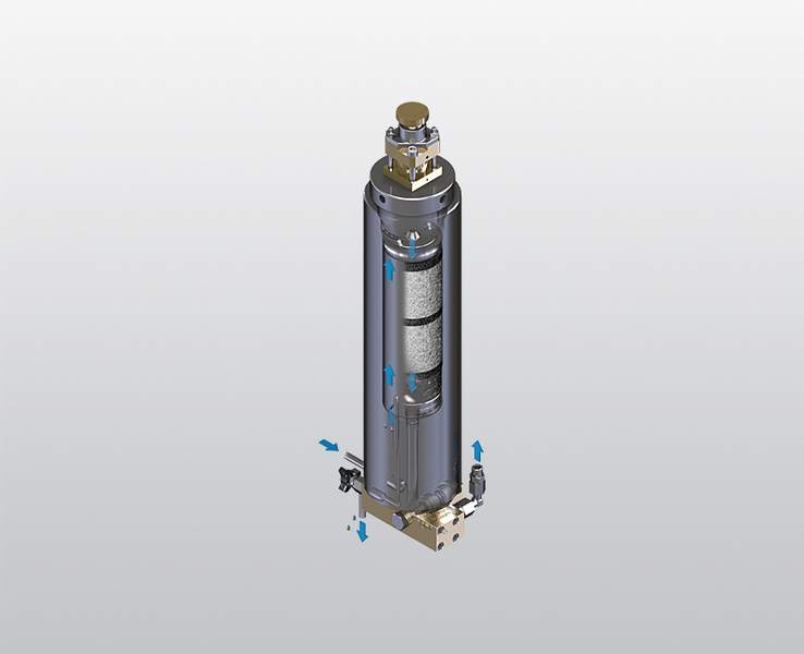Oczyszczone powietrze przepływa następnie przez system filtracyjny P, który pochłania pozostałe cząsteczki wody w postaci pary, usuwając jednocześnie niebezpieczne substancje z powietrza do oddychania.